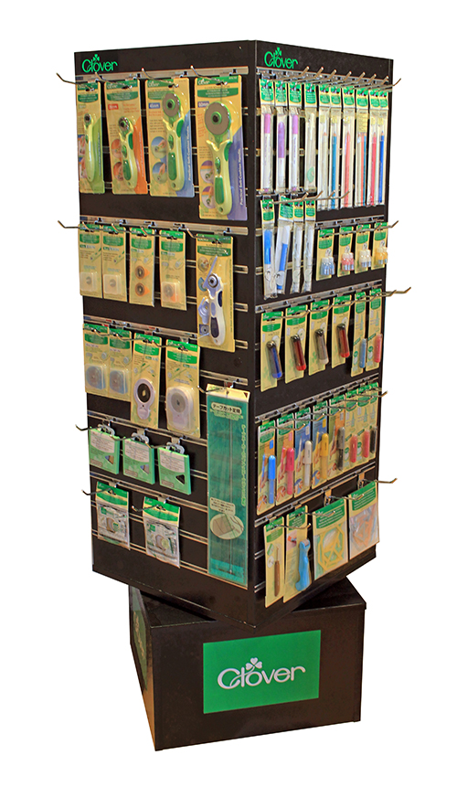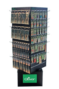 The Knitting stand features Takumi Needles in Fixed Circular, DPN’s and Single Point, Amour Crochet Hooks and Clover Knitting Accessories, while the Quilting stand includes Rotary Cutters, Marking Pens, Chaco Pens, Wonder Clips and Quilting Accessories.