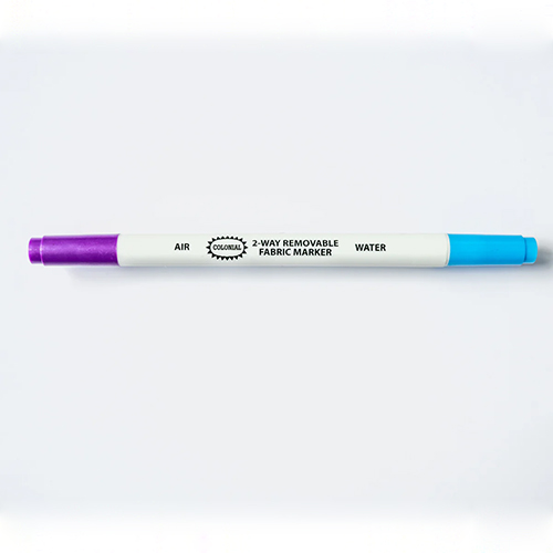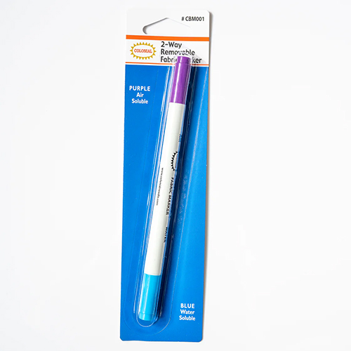 Colonial 2-Way Removable Fabric Marker. Dual-sided marking pen. The Blue side is water soluble and can be removed when desired with a damp cloth or with washing. The purple side is air soluble and will disappear after a few hours or with a damp cloth. Perfect for all types of craft applications.