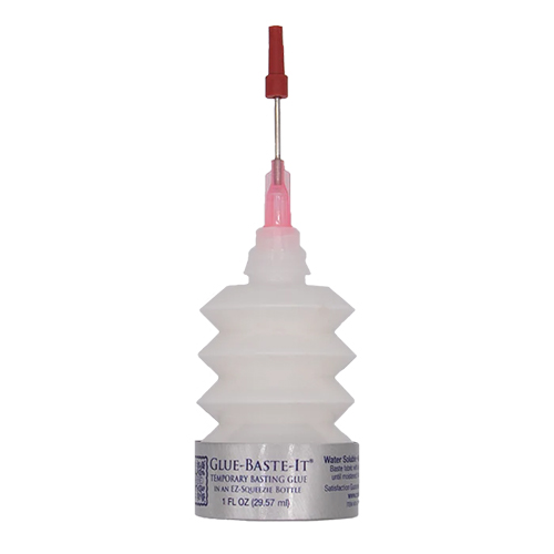 Baste it Glue (1oz. Ez-squeezie Bottle) a temporary glue for applique, hems, quilt binding, and more. Holds any sewing or craft projects in place without pins or clips. 100% water-soluble, pH neutral, dries clear and flexible, and holds firmly until moistened or washed. Made in the USA